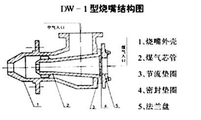 DW—1型低壓渦流式煤氣燒嘴是目前應(yīng)用較廣泛的一種有焰燒嘴,其主要特點(diǎn)是結(jié)構(gòu)簡單,所需煤氣壓力要求低,燒嘴空氣通道內(nèi)設(shè)有渦流導(dǎo)向葉片,使空氣產(chǎn)生切向分速度,在旋轉(zhuǎn)前進(jìn)的情況下和煤氣相遇,強(qiáng)化了空氣與煤氣的混合過程,因而混合條件較好,可以得到較短的火焰。該燒嘴可用于燒凈發(fā)生爐煤氣、混合煤氣和焦?fàn)t煤氣等。